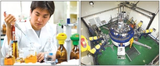 ▲ 방사선융합기술을 연구하고 있는 모습(왼쪽)과 정읍방사선과학연구소 내에 사이클로트론(원형입자가속기).