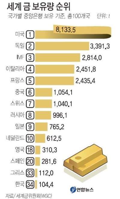 8일 세계금위원회(WGC)의 국별 금 보유량 통계(중앙은행 보유 기준)에 따르면 현재 한국의 금 보유량은 104.4t으로 조사 대상 100개국 가운데 34위를 차지했다.