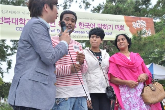 ▲ 전북대에서 열린 외국인 유학생'한국어 말하기 대회'에서 유학생들이 사회자의 질문에 대해 한국어로 말하고 있다.
