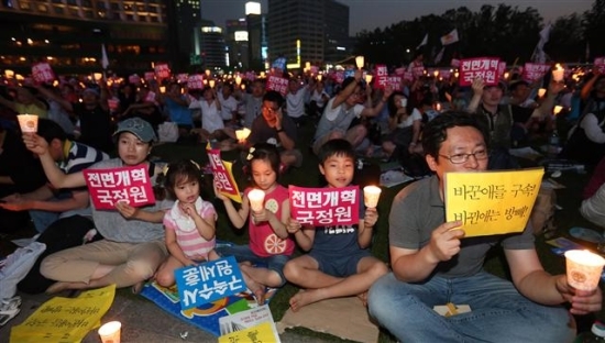 ▲ 촛불 든 가족 지난 6일 오후 서울광장에서 열린 '국정원 규탄 범국민대회'에 참가한 한 가족이 국정원의 선거 개입 및 수사 은폐, 축소를 규탄하며 촛불을 들고 구호를 외치고 있다. 연합뉴스