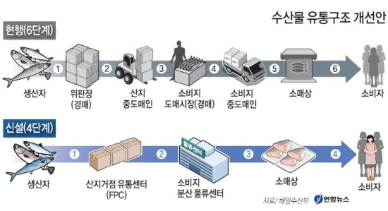 이에 따르면 현재 '생산자→산지 위판장→산지 중도매인→소비지 도매시장→소비지 중도매인→소매상→소비자' 등 6단계의 연근해산 수산물 유통구조를 4단계로 줄이기로 했다.