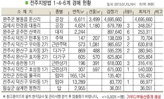 △전주시 덕진구 우아동 2가 (근린주택)= 본 건은 전주 아중중학교 남측 인근에 위치하고, 주위는 근린생활시설·다가구주택 등이 혼재하는 지역이며,인근에는 아파트단지·학교시설 등이 소재한다. 제반 차량의 접근이 자유롭고, 인근에 시내버스 승강장이 소재하며, 동측인근으로 동부우회도로가 통과하는 등 일반적인 교통조건은 무난하다. 남측으로 노폭 약20미터, 북측으로 노폭 약 6미터의 포장도로와 접하며 세로장방형의 평탄한 토지이고, 건부지로 이용 중이다. 기본적인 위생설비 및 승강기설비가 되어 있고, 4층에는 도시가스에 의한 난방설비가 되어 있다.