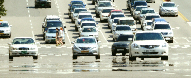 전주의 낮 최고기온이 33도를 기록한 11일 전주 빙상경기장 앞 백제로 아스팔트에 열기가 피어오르고 있다.