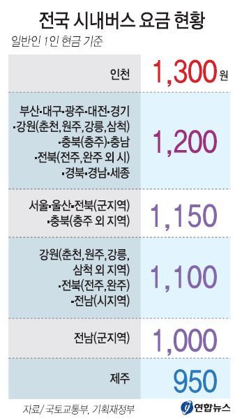 16일 국토교통부와 기획재정부 등에 따르면 2013년 현재 일반인 1인 현금 기준 전국 시내버스 기본요금은 평균 1천152원이었다. 지역별로는 950원∼1천300원이었다. 기본요금이 가장 비싼 곳은 인천시(1천300원)였다. 부산과 대구, 광주, 대전 등13곳도 1천200원으로 평균보다 높았다.