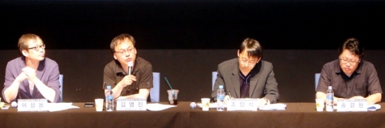 ▲ 16일 전주디지털독립영화관에서 열린 제14회 전주국제영화제 평가공청회에서 김영진 수석 프로그래머가 답변하고 있다. 왼쪽부터 이상용 프로그래머, 김영진 수석 프로그래머, 조인석 예원대 교수, 송경원 씨네21 기자. 추성수기자chss78@