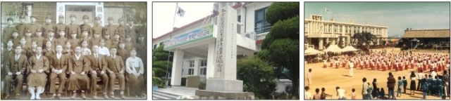 ▲ (왼쪽부터)1939년 치문초 26회 졸업생 기념사진, 1955년 세워진 독립운동가 신익희 선생의 친필 휘호 비석, 1982년 운동회 모습.