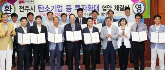 전주시 팔복동 산단에 자리한 (주)하이엠시, (주)옵토웰 등 13개 기업은 17일 전주시청에서 송하진 시장과 이명연 시의회 의장 등이 참석한 가운데 투자 확대 협약을 체결했다.