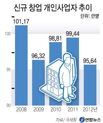 이는 2011년 99만4천386명에 비해 3.8% 줄어든 것으로, 개인사업자 창업 감소는2009년 이후 3년만이다.