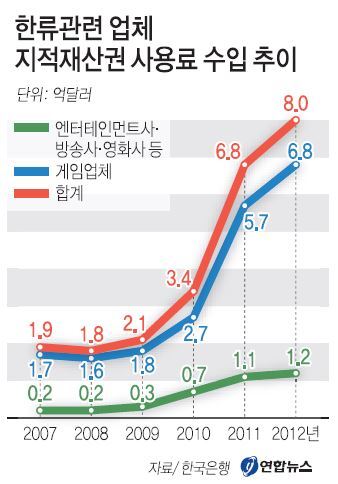 작년 한국의 전체 지적재산권 사용료 수입이 34억4천만달러이니, 전체의 약 23.3%를 한류관련 업체가 차지한 셈이다. 이 비율은 2011년(약 15.7%)보다 대폭 늘어난것이다.