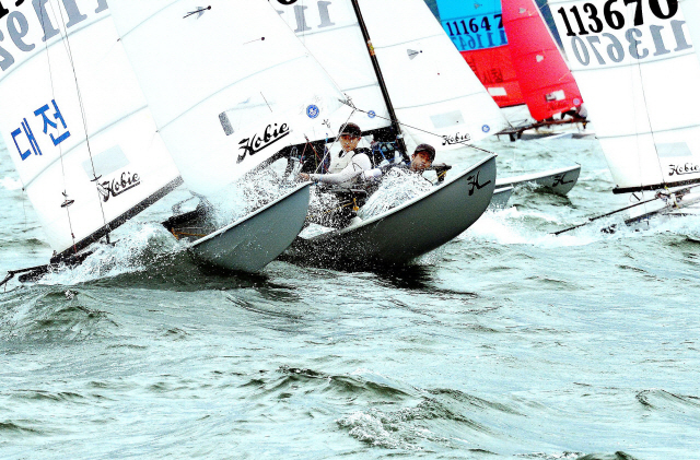 20일 제27회 대통령기 전국시도대항요트대회가 부안 격포항에서 열린 가운데 2인요트 호비16 종목에 참가한 선수들이 파도를 가르며 바다로 질주하고 있다.