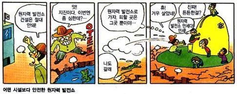 또 다른 사례는 고등학교 '경제지리'(교학사) 교과서의 71쪽이다. 탐구활동의 예시로 제시된 '어떤 시설보다 안전한 원자력발전소'라는 제목의 네컷 짜리 만화이다. 만화의 내용은 '원자력발전소 절대 안돼!'라고 외치던 주민이 지진이 나자 '앗! 지진이다. 이번엔 좀 심한데'라며 급히 원전으로 대피한다.