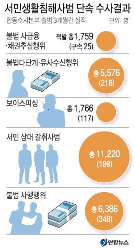 전국 18개 지검에 합동수사부가, 40개 지청에 전담수사반이 설치돼 검사 236명과 수사관 544명 등 총 780명의 수사인원이 투입됐다.범죄유형별 입건자(구속자)는 불법 사금융·채권추심행위 1천759명(25명), 불법다단계·유사수신행위 5천576(218명), 보이스피싱 1천776명(117명), 서민상대 갈취사범 1만1천220명(199명), 불법사행행위 6천386명(346명) 등으로 집계됐다. 연합뉴스