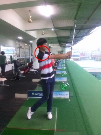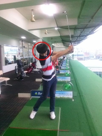 공을 치고 난 후에도 사진 1과 같이 머리를 공 에 남겨야 한다. 의식적인 몸에 힘 빼기와 거울 앞에서의 연습을 통해 연습해보는 것이 더욱 빨리 자세를 익히는 방법이 된다.