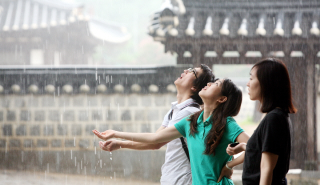 23일 전주 최고기온이 35.9도로 전국에서 가장 더운 날씨를 기록하는 등 찜통날씨가 이어진 가운데 전주 한옥마을 경기전을 찾은 시민들이 시원하게 떨어지는 빗방울을 바라보고 있다.