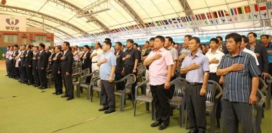 ▲ 25일 무주읍 반딧불체육관에서 열린 무주군 농업경영인 한마음대회에서 참석자들이 국민의례를 하고 있다. 사진제공=농업경영인 무주군연합회