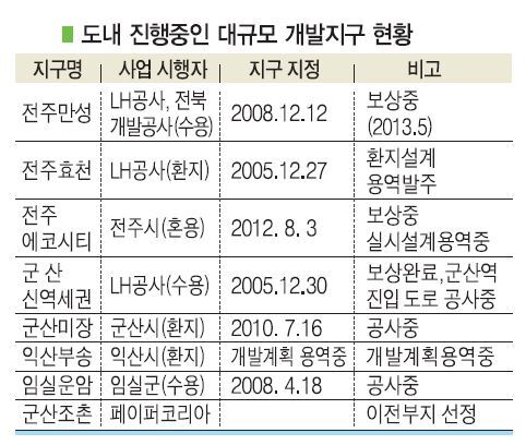 또 군산은 신역세권과 미장지구, 익산은 부송지구, 임실에서는 운암지구 조성사업이 추진되고 있다. 그러나 이들 택지개발사업과 도시개발사업 대부분이 지구지정이 된지 5∼10년이 지났는데도 개발공사에 들어가지 못하는 등 장기화 된다는 게 문제점으로 지적된다.