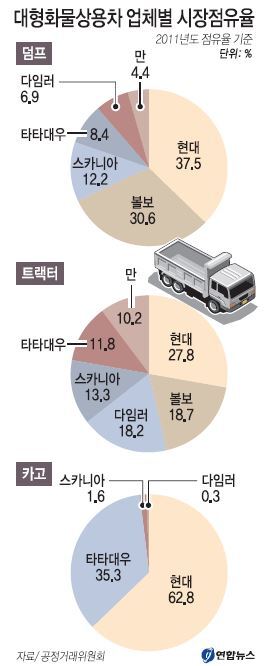 공정위는 대형화물차 시장에서 판매가격을 담합한 현대자동차와 다임러트럭코리아, 볼보그룹코리아, 타타대우상용차, 만트럭버스코리아, 스카니아코리아 등 7개사에 시정명령과 함께 과징금 총 1천160억원을 부과하기로 했다고 29일 밝혔다.
