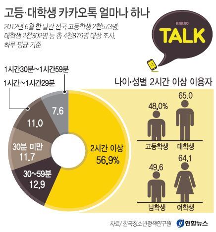 전국 고등학생과 대학생 10명 중 5∼6명은 하루평균 2시간 이상 모바일 메신저인 '카카오톡'을 한다는 조사 결과가 나왔다.