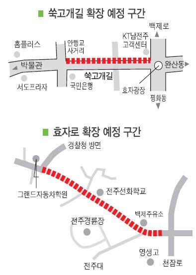 전주지역 대표적인 상습정체구간인 효자로(그랜드자동차학원∼천잠로)와 쑥고개길(안행교 사거리∼효자광장) 확장사업이 본격 추진된다.