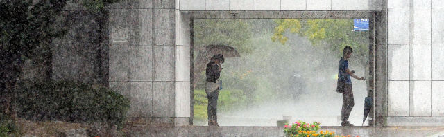 30일 낙뢰를 동반한 폭우에 전북대 정문에서 잠시 몸을 피한 남녀학생의 모습이 한 폭의 수채화를 닮았다.