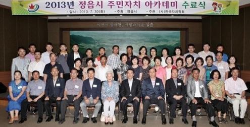 시는 지난 30일 오후 정읍시청 5층대회의실에서 김생기시장과 주민자치위원 50여명이 참석한 가운데 '2013년 정읍시 주민자치 아카데미'수료식을 갖고 참여와 소통을 통한 주민공동체를 만들어갈것을 다짐했다.