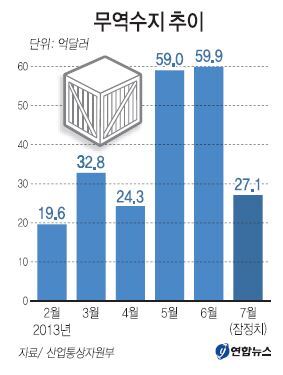 1∼7월 수출액은 3천224억8천700만달러로 작년 동기 대비 0.9% 올랐으나 수입은2천997억5천100만달러로 2.1% 감소했다. 이 기간 무역수지 흑자는 총 227억3천600만달러로 집계됐다.