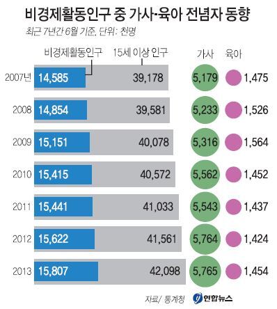 15세 이상 노동가능인구 중 가사와 육아에만 전념하는 사람이 통계 작성 이래 최대 수준으로 불어났다.