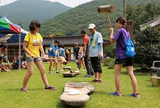 ▲ 외국 소녀들에게 인기를 모았던 완주 용진 두억마을의 전통방식의 떡메치기. 사진제공=완주군
