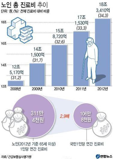 2012년 기준 65세 이상 노인 1인당 연간 진료비는 311만4천원으로 국민 1인당 연간 진료비 106만8천원에 견줘 2.9배 가량 많았다. 연합뉴스