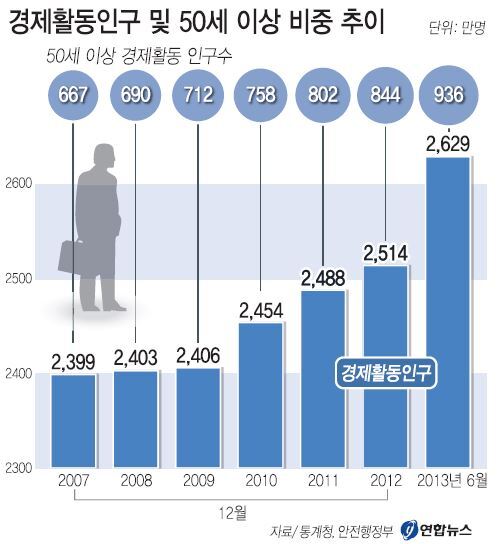 이 수치는 2010년 3월 30.5%로 30%선을 돌파한 데 이어 상승세를 이어가 작년 12월 33.6%였고 올해 들어 더욱 높아졌다. 경제활동인구 중 60세 이상 비중도 올해 6월 13.6%로 사상 최고였다. 이 수치는 10년 전인 2003년 6월 9.8%에 그쳤다. 연합뉴스