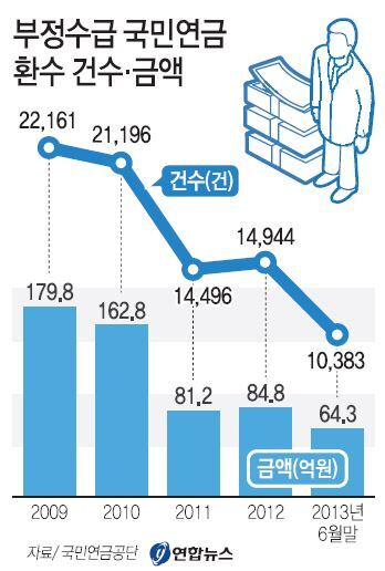 이처럼 사망·실종 등 여러 이유로 국민연금 수급 자격·종류 등이 바뀌었는데도 이를 제대로 신고하지 않은 가입자·가족의 도덕적 해이와 연금공단의 허술한 관리가 겹쳐 지난 5년 동안 570억원 이상의 국민연금 재정이 엉뚱한 곳에 줄줄 새어 나갔다. 13일 국민연금공단이 국회 보건복지위 신의진 의원(새누리당)에게 제출한 자료를 보면, 최근 5년(2009~2012년 6월) 동안 국민연금이 잘못 지급돼 환수가 결정된 경우는 모두 8만3천180건, 금액으로는 572억9천300만원에 이르렀다.