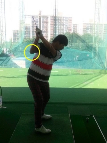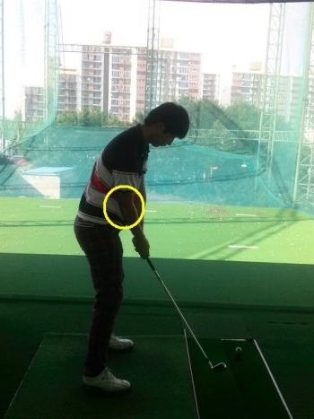 사진과 같이 오른쪽 팔꿈치가 왼팔의 아래에서 움직여주면 오른 손으로 마음껏 볼을 쳐도 좋은 샷이 나온다. 그러나 오른팔이 왼팔보다 위에서 움직이며 오른손으로 볼을 치면 모두 미스샷이 된다.