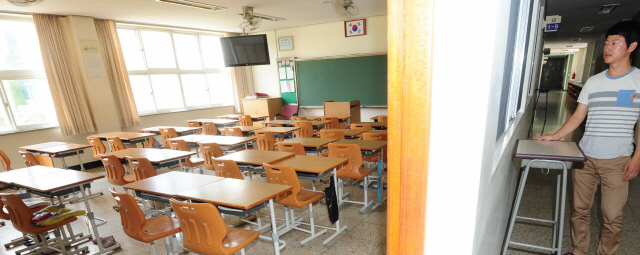 기록적인 폭염으로 전주 호남제일고가 개학을 14일에서 다음주 월요인인 19일로 연기한 가운데 당직교사가 빈 교실을 바라보고 있다. 현재 전북지역 4개 학교가 폭염으로 개학을 연기했다.