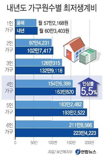 1인, 2인, 3인 가구의 최저생계비는 각각 60만3천403원, 102만7천417원, 132만9천118원으로 인상됐다. 5인과 6인 가구의 경우 각각 193만2천522원, 223만4천223원으로 올랐다.