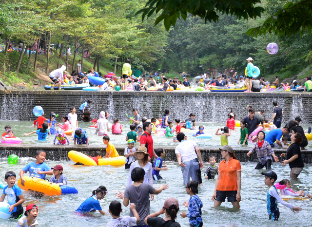 폭염경보가 발효중인 18일 완주군 고산자연휴양림을 찾은 아이들과 시민들이 물놀이를 하며 더위를 식히고 있다.