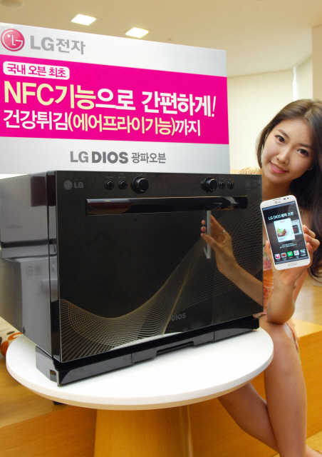 LG전자는 19일 스마트폰으로 요리부터 내부 청소까지 할 수 있는 디오스 광파오븐을 출시했다. 이 제품은 국내 오븐 제품으로는 처음 NFC(근거리무선통신) 기능을 탑재해 스마트폰 앱에서 220여 가지의 원하는 요리를 선택한 뒤 오븐 태그에 스마트폰을 갖다대면 조리 기능·온도·시간이 자동으로 설정되는 것이 특징이다. 연합뉴스