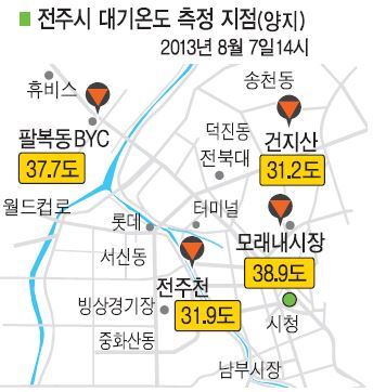 19일 전북녹색연합에 따르면 지난 7일 오후 2시 전주의 낮 기온을 잰 결과 전주 모래내 시장과 팔복동 공단 인근 지역의 기온이 각각 38.9℃와 37.7℃로 가장 높았다.