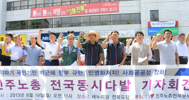 민주노총 전북본부는 19일 전주 경원동 새누리당 전북도당 앞에서 철도와 공공부문 민영화 중단 및 복지공약 이행을 촉구하는 기자회견을 갖고 있다.