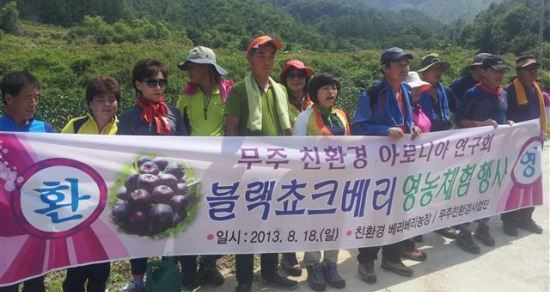 ▲ 지난 18일 무주 안성면 블랙초코베리 농장에서 수확체험에 나선 도시민들이 기념촬영을 하고 있다.