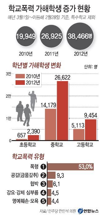 민주당 안민석 의원이 전국 시·도 교육청에서 받아 25일 공개한 '최근 3년간 학교폭력 가해학생 조치 현황'을 보면 지난 2010년에서 2012년(매년 3월 1일∼이듬해 2월 28일 기준) 학교폭력 가해학생은 92.8% 증가했다.