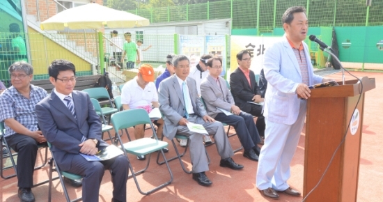 ▲ 25일 전주 덕진체련공원 테니스코트에서 열린 제24회 전북직장대항 테니스대회에서 백성일 전북일보 상무이사가 인사말을 하고 있다. 추성수기자 chss78@