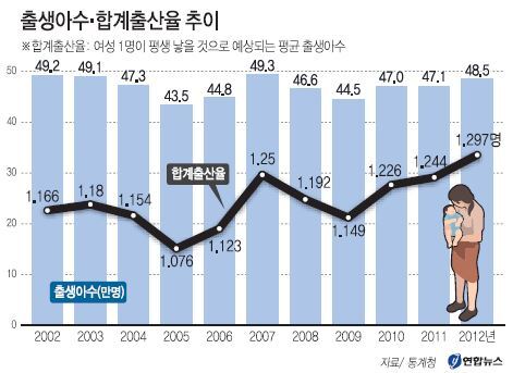 여성 1명이 평생 낳을 것으로 예상되는 평균 출생아 수인 합계출산율은 1.297명으로 2001년(1.297명) 이후 최고치인데다, 2010년부터 3년 연속 증가세다.