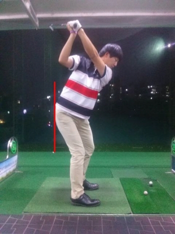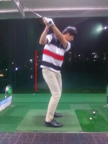 이 선이 백스윙 과정에서 사진2와 같이 힙 뒤로 내려진 선에 힘이 닿아서 유지해야 한다.