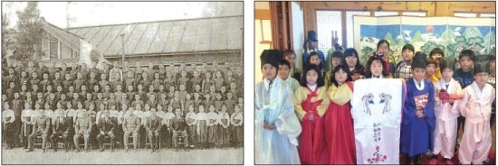 ▲ 1939년 만경초 제28회 졸업사진(왼쪽). 만경초는 전통예절교육 등 인성함양 프로그램을 실시하고 있다.