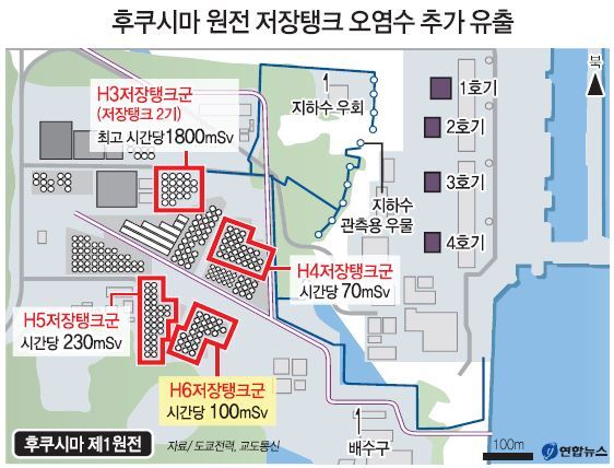 추가로 확인된 곳은 지난달 19일 약 300t의 오염수 유출이 생긴 지상 저장탱크가 위치한 H4 구역에서 남서쪽으로 약 100m 떨어진 H5 구역이다. 연합뉴스