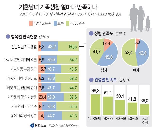 8일 한국보건사회연구원 김승권·김연우 연구원의 '가족생활의 질'이란 연구보고서를 보면, 2012년에 국내 15~64세 기혼가구(남자 1800여명, 여자 8220여명)를 대상으로 가족생활 만족도를 살펴봤다. 조사결과, '전반적인 가족생활'에 대해 50.5%가 만족했다. 보통은 43.2%, 불만족은 6.3%였다.