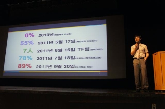 김승환 교육감은 "'혁신학교를 넘어서 학교의 혁신으로'를 슬로건으로 내건 이유가 학교를 감옥처럼 여기지 않고 세상에서 가장 좋아하는 배움의 공간으로 만들고 부모 다음으로 교사를 세상에서 가장 존경하는 사람으로 여기도록 하기 위해서"라면서 "혁신학교를 통해 아이들의 행복한 교육 공동체를 만드는 게 가장 중요하다"고 강조했다.