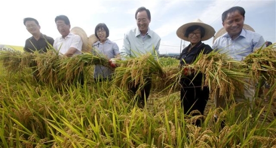 도마위에 오른 사진은 지난해 8월 21일 전주시 호성동 하오마을에서 송하진 전주시장 등이 참가한 '첫 벼 베기' 현장 사진이다.