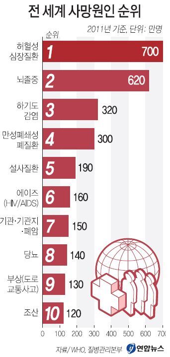질병관리본부 감염병감시과 인혜경 연구원은 10일 세계보건기구(WHO)의 '전 세계 10대 사망원인(The top 10 causes of death)'과 우리나라 통계청의 '2011년 사망원인 통계'를 인용해 이같이 밝혔다.