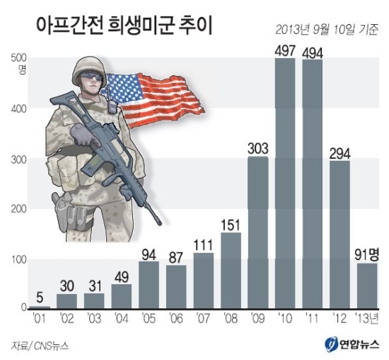 11일(현지시간) 미국 인터넷매체 'CNS뉴스'에 따르면 지난 2001년 9·11테러 발생 사흘만에 미국 의회가 사실상 전쟁을 승인한 뒤 지금까지 12년간 아프간전에서 목숨을 잃은 미국 군인은 총 2144명으로 집계됐다. 연합뉴스